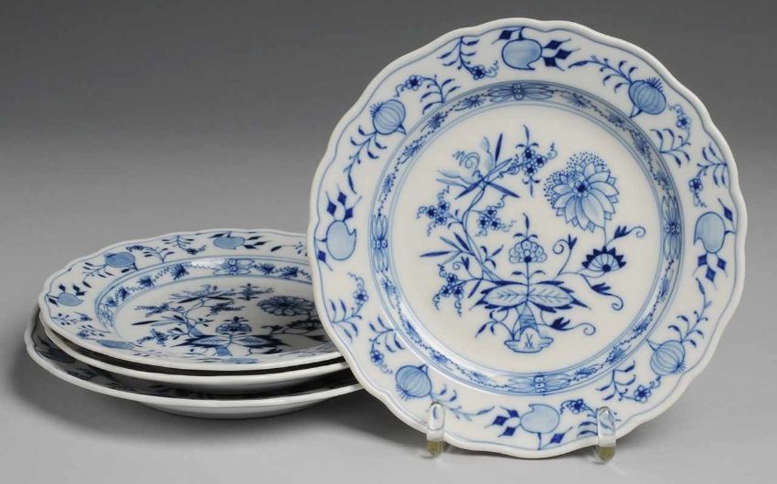 Vier Teller "Zwiebelmuster" Weiß, glasiert. Gebogte Ränder. Uglbl. Bemalung. 3 x Knaufschwertermarke, 1 x 2 u. 1 x 3 Schlstr. sowie Schwertermarke, 3 Schlstr. D. 20,5/ 21 cm. (88) Meissen. E. 19./ A. 20. u. 2. H. 20. Jh.