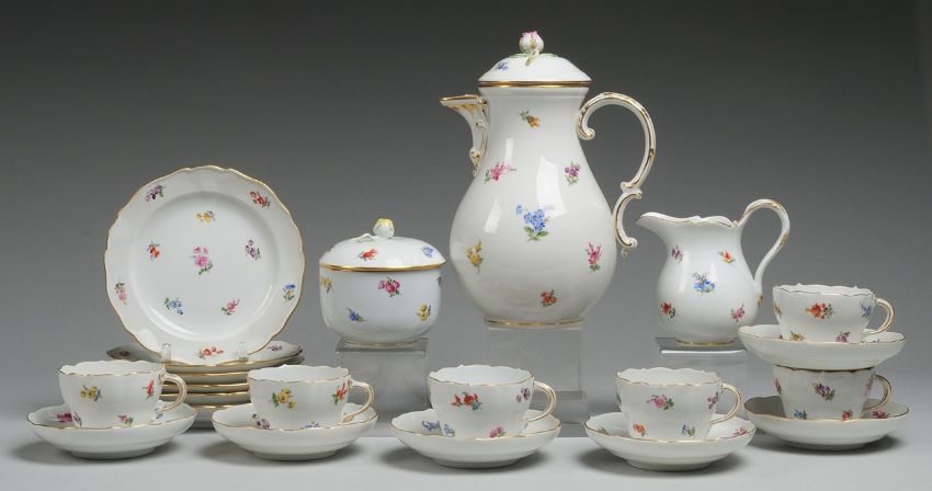 21-tlg. Weiß, glasiert. Kernstück u. 6 Gedecke. Form "Neuer Ausschnitt". Polychrome Bemalung. Geringfügige Gebrauchsspuren, 1 x UT rest. u. Rosenknauf der Kanne u. Zuckerdose minim. best. Schwertermarke. H. (Kanne) 25,5 cm. Meissen. 1924-1933/ 2. H. 20. Jh. (Kanne).