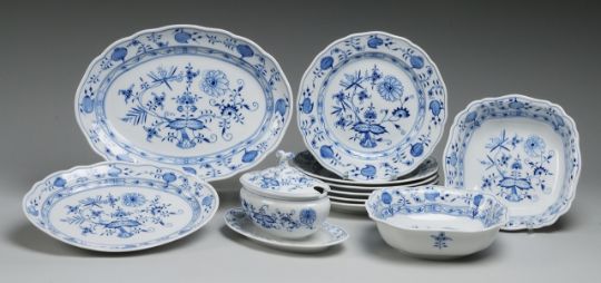 11-tlg. Weiß, glasiert. 6 Speiseteller, Paar Ovalplatten, Paar Karreeschüsseln u. kleine Terrine. Form "Neuer Ausschnitt". Uglbl. Bemalung. Schwertermarke, 1. Wahl. D. (Teller) 25,5 cm. Meissen. 2. H. 20. Jh.