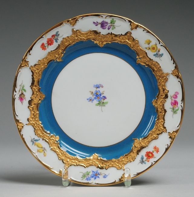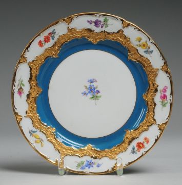 Weiß, glasiert. Kräftiger Rocaillenreliefdekor. Part. türkisfarbener Fond. Polychrome Bemalung mit Blütenstängeln. Staffage in Matt- u. Glanzgold. Schwertermarke, 1. Wahl. D. 19,5 cm. Meissen. M. 20. Jh.
