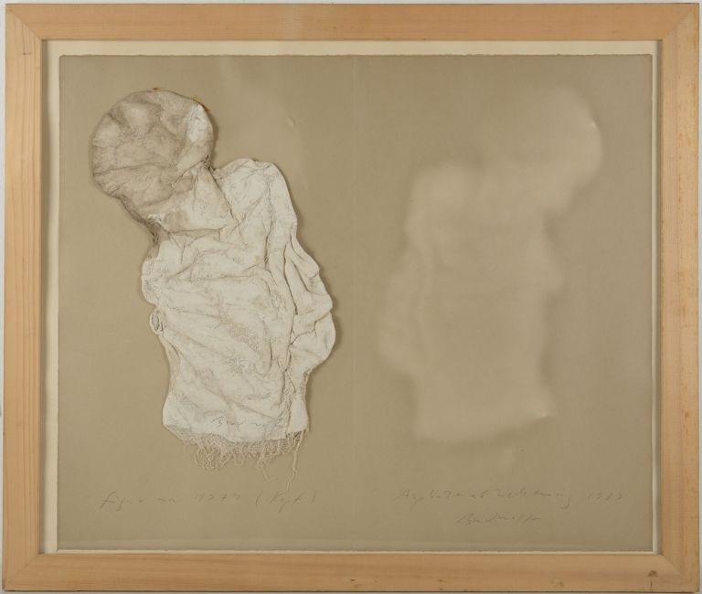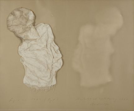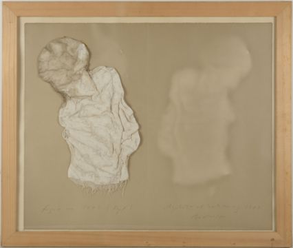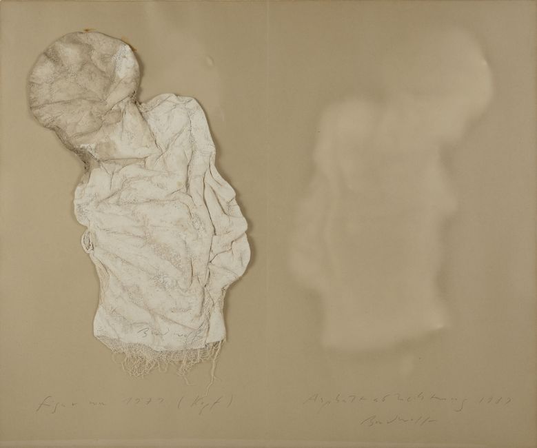 Brodwolf verwendet zahlreiche Gebrauchsgegenstände, wie etwa Pinsel, Stoffe, Ofenkacheln usw., die er in seinen Werken ein- und verarbeitet. Somit verlieren diese Gegenstände ihre ursprüngliche Bedeutung und Funktion und werden zu Teilen seiner Kunstwerke. In seine Arbeit fließen deutlich die Kenntnisse über Einsatz, Gebrauch und Eigenschaften verschiedener Substanzen, die er während seiner Tätigkeit als Restaurator erworben hat, mit ein und erzeugen das enorm breite Variations-Spektrum seines Œuvres. (Galerie Henze & Ketterer: Jürgen Brodwolf - Werke einer Sammlung 1962-1982, Wichtrach/Bern, 1992). In diesem Bild verformt er Gipsbinden zu einer Gestalt, deren Abklatsch er zehn Jahre später zu einem eigenständigen Kunstwerk erhebt und dem Original zur Seite stellt.