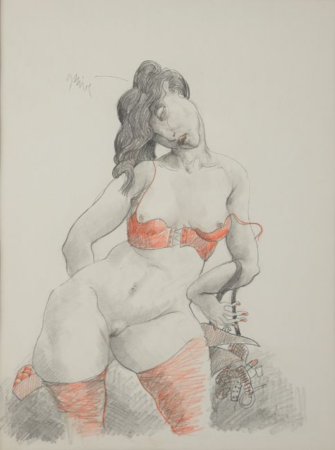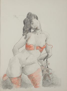 Blei- und roter Farbstift auf Zeichenkarton, ca. 40 x 30 cm (Passepartout-Ausschnitt), hinter Glas gerahmt, in der Darstellung signiert, rückseitig auf Rahmen betitelt "Femme débauchée, sac" und bezeichnet 93.D.22.
