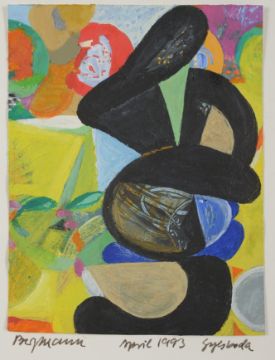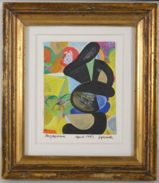 Mischtechnik Acryl auf bedrucktem Papier, 10,6 x 8,3 cm, hinter Glas in vergoldetem Rahmen gerahmt und im Passepartout freigestellt montiert, rückseitig auf Rahmen bezeichnet "Große dunkle Form... und eine Katze, die sich wundert. Über- und Weitermalung mit Acrylfarben auf bedrucktem Papier. April 1993 Gylsboda", Größenangabe, hier nochmals signiert.