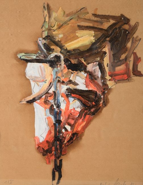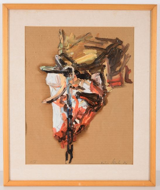 Oil on wrapping paper, 49.5 x 40.5 cm, framed behind glass and in passepartout, signed and dated (19)86 in pencil lower right, inscribed "1/V" lower left.