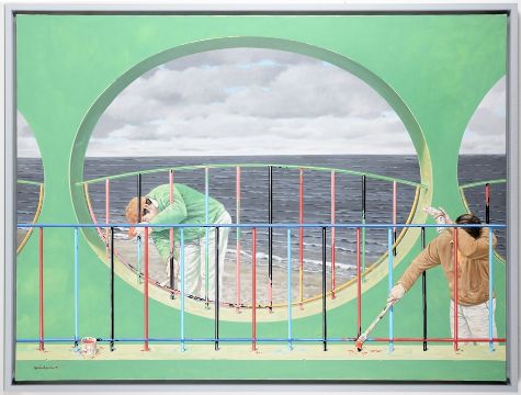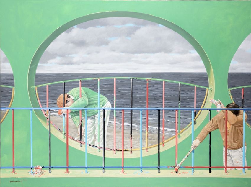 The painting "Playground" by Volker Blumkowski shows a fascinating scene that captivates with its precise attention to detail and subtle symbolism. Two figures, absorbed in the work of painting a railing, are at the center of the composition. The bright colors of the railing struts contrast with the cool, gray-blue expanse of the sea in the background, which is visible through the round openings of an architectural structure. The scene appears simultaneously everyday and surreal, characterized by a quiet tension between human activity and the infinite natural world. Blumkowski succeeds in creating a narrative depth that encourages the viewer to reflect on the relationship between man, work and the environment.